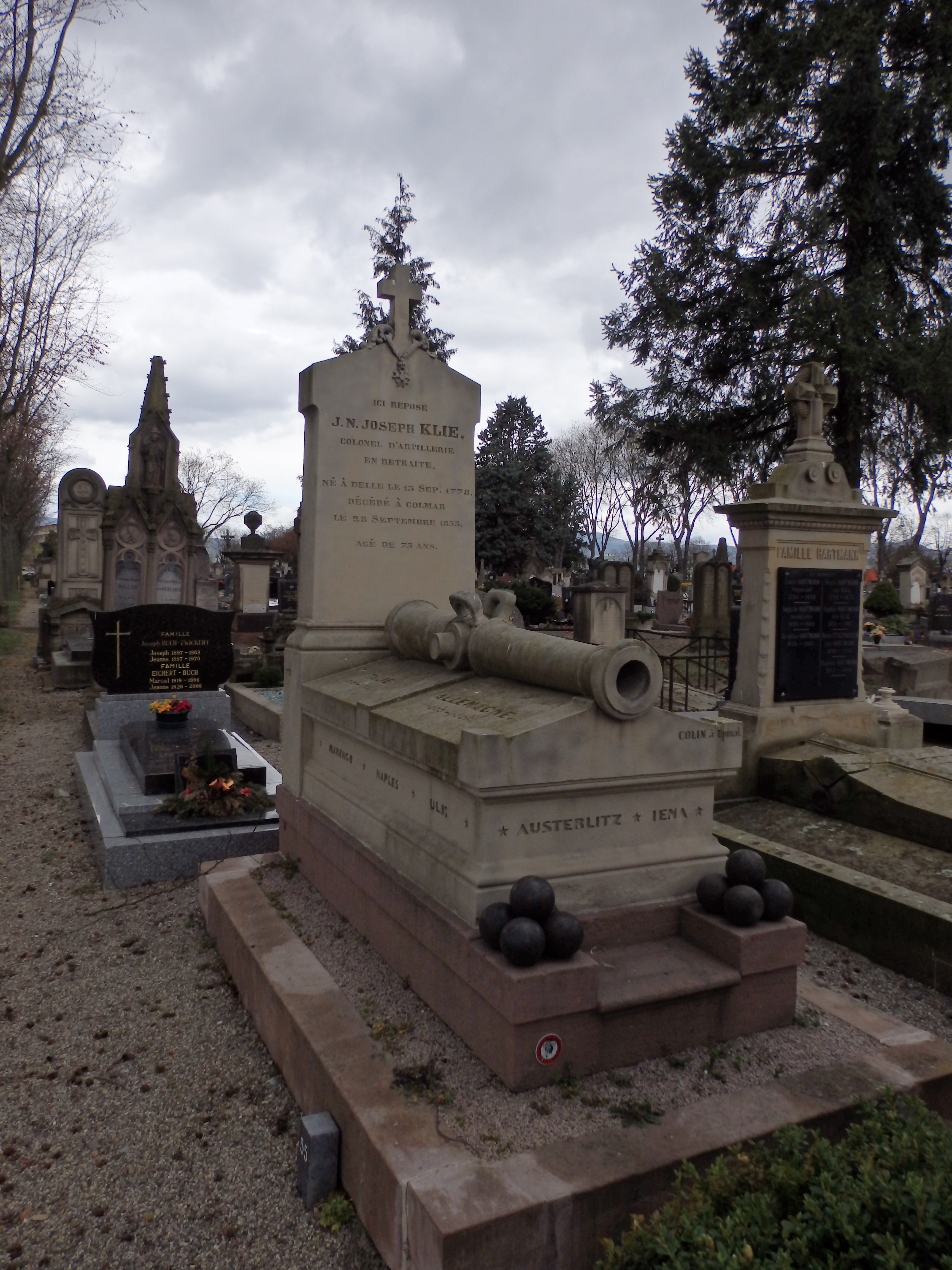 Rentré en France en 1814, il sera nommé commandant de l’artillerie à Belfort (1815) où il se marie avec Caroline Gérard (1816) qui lui donnera quatre enfants. Lieutenant-colonel en 1820, colonel d’artillerie en 1828 et inspecteur des Fonderies à Paris (1821-31), il commandera la Garde nationale à Colmar en 1848, ville où il décédera et sera inhumé en 1853. Chevalier de la Légion d’honneur en 1811, officier en 1812 et commandeur en 1838, le colonel d’artillerie François Klie totalise 15 campagnes en 21 ans, 8 mois et 10 jours de services. Il s’était notamment distingué à Vaprio, Alexandrie, Tartonne et Novi, Marengo et Naples, Ulm et Austerlitz, Iéna et Saragosse, Wagram, Wuisma, La Moskowa et la Bérésina, batailles dont certaines sont gravées sur sa tombe.