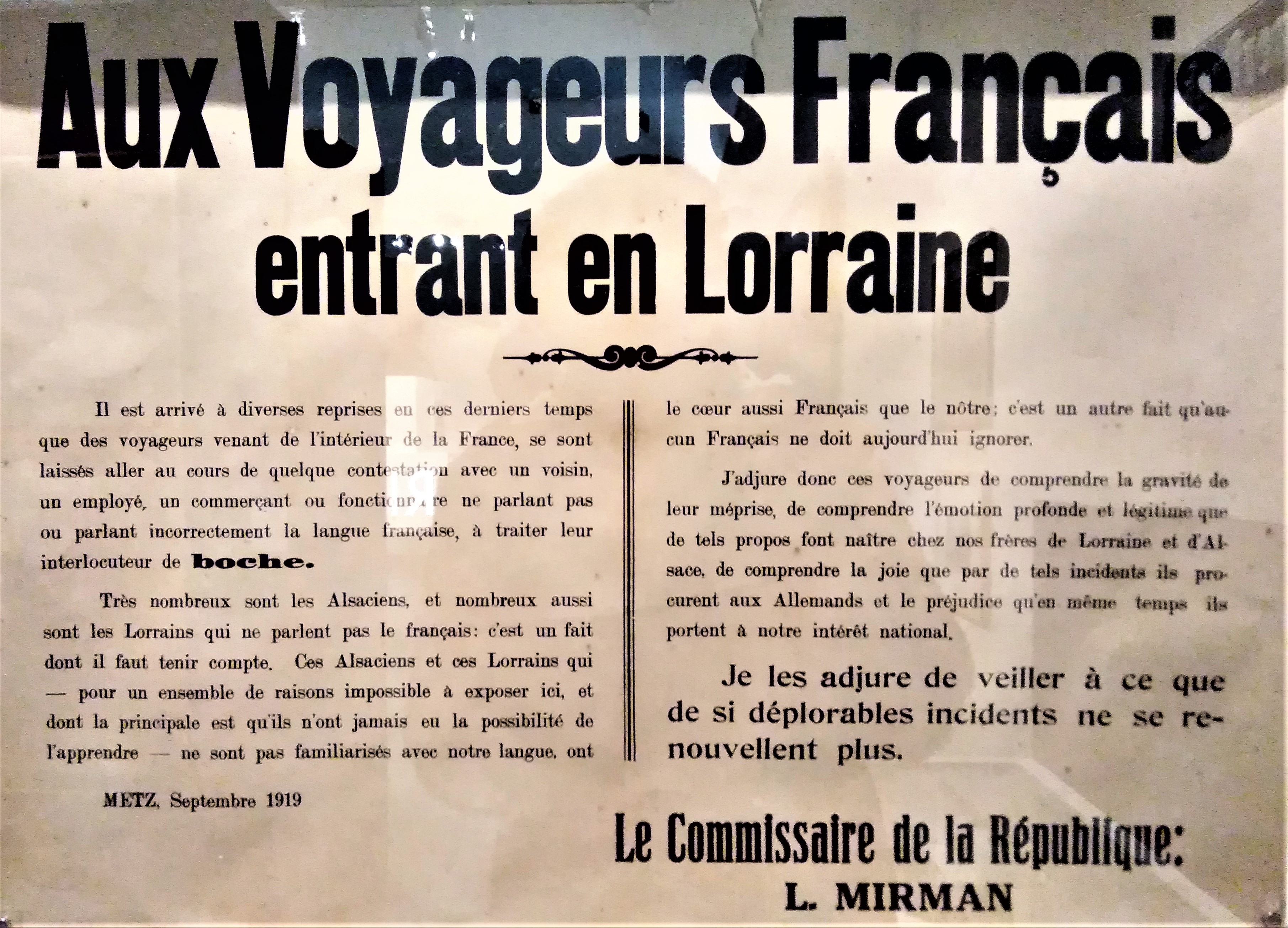 Par contre, certains Français étaient si agressifs vis à vis des autochtones qu’ils traitaient de Boches, que le Commissaire de la République de Metz, Léo Mirman a fait afficher une mise au point.