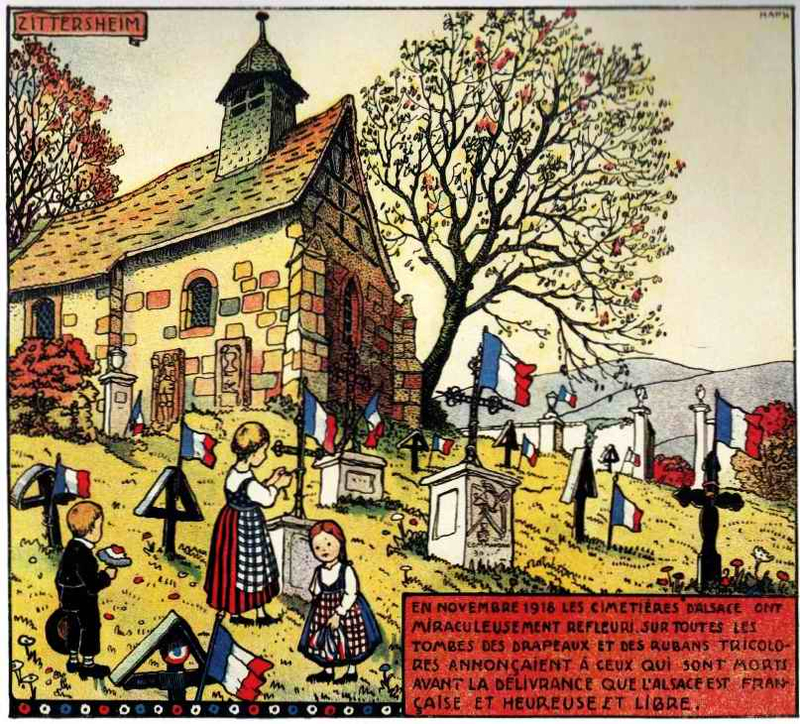 Légende de l’image : « En novembre 1918, les cimetières d’Alsace ont miraculeusement refleuri sur toutes les tombes. Des drapeaux et des rubans tricolores annonçaient à ceux qui sont morts avant la délivrance que l’Alsace est française et heureuse et libre ».