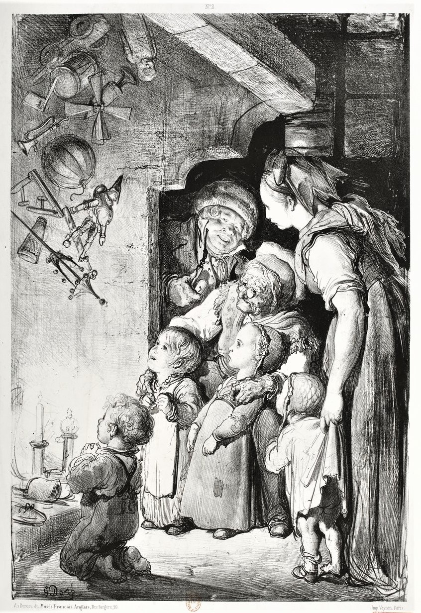 Derrière Christkindel, la porte ouverte laisse apercevoir les bougies qui illuminent les joujoux étalés dans la pièce voisine. La joie des enfants est au comble, mais soudain elle se change en épouvante.