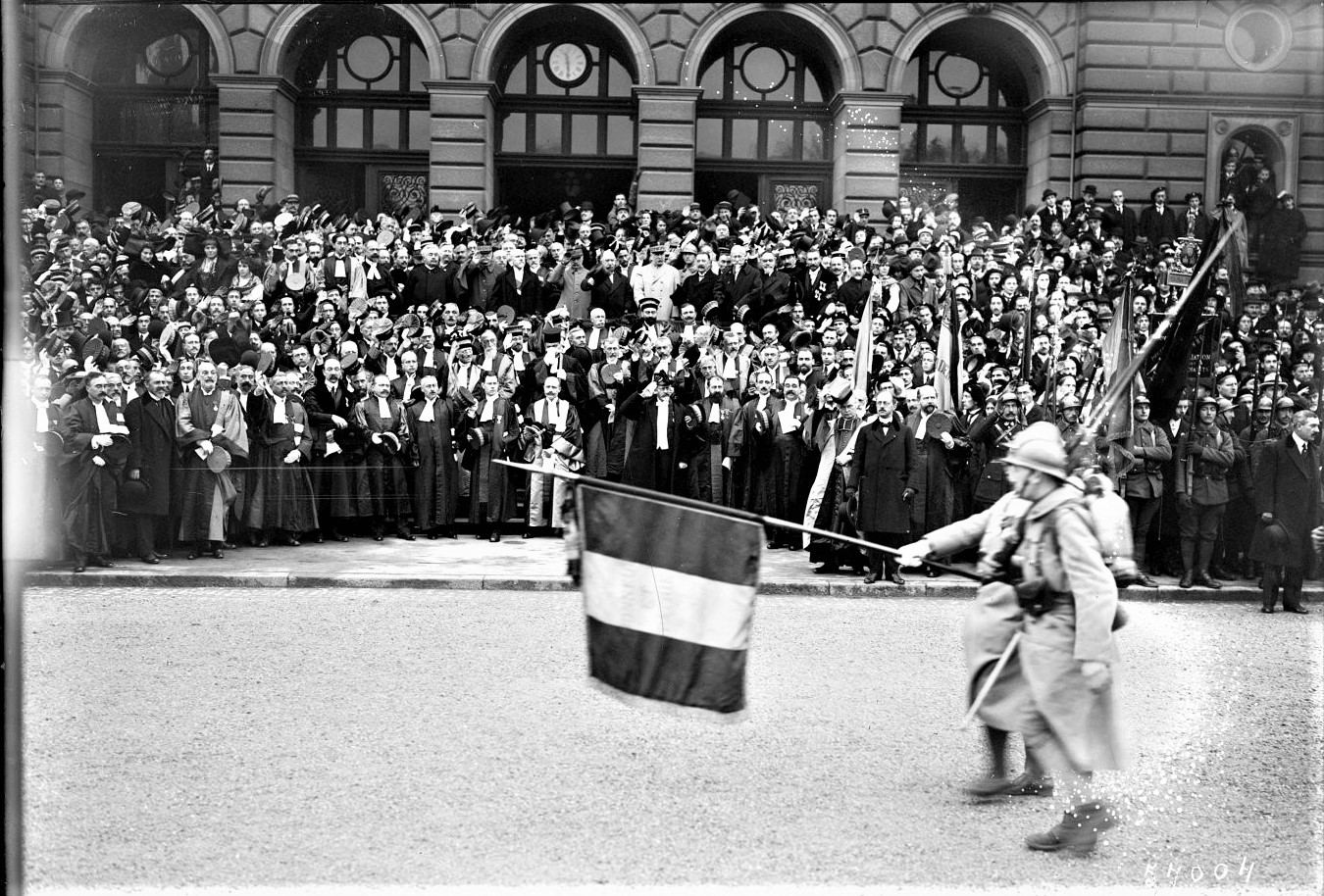 Vers 9h30, la musique d’un régiment colonial passait avec le drapeau ; un bourgeois âgé regardait le cortège, lorsque, soudain, un officier sortit et arracha à l’homme stupéfait sa casquette de la tête, avec une telle brutalité que la casquette s’en alla voler dans les rangs des troupes qui défilaient. D’une pâleur de mort, celui qui venait d’être ainsi rappelé à l’Ordre ramassa alors sa casquette, tandis que s’amassait la foule, très excitée par cet incident.