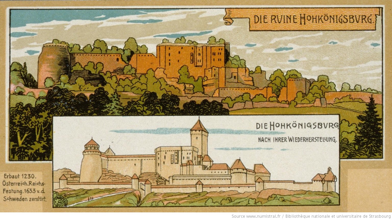 Le château de la Hohkönigsburg a été érigé au 12ème siècle, puis démoli par les Suédois en 1633, durant la guerre de 30 ans. Le club vosgien (Vogesenklub) fondé en 1872 trace de nombreux chemins de randonnées en montagne. Très vite, la ruine de la Hohkönigsburg devient le lieu de promenade privilégié des promeneurs alsaciens. En 1899, le château est offert par la ville de Schlestadt à l’empereur Wilhelm II qui confie sa restauration à l’architecte berlinois Bodo Ebhardt qui se charge de lui rendre son état originel. Les superbes peintures de style médiéval sont réalisées par l’artiste alsacien Léo Schnug. Des crédits de pour la restauration du château son voté par les députés du Landesausschuss. L’abbé Wetterlé vote contre.