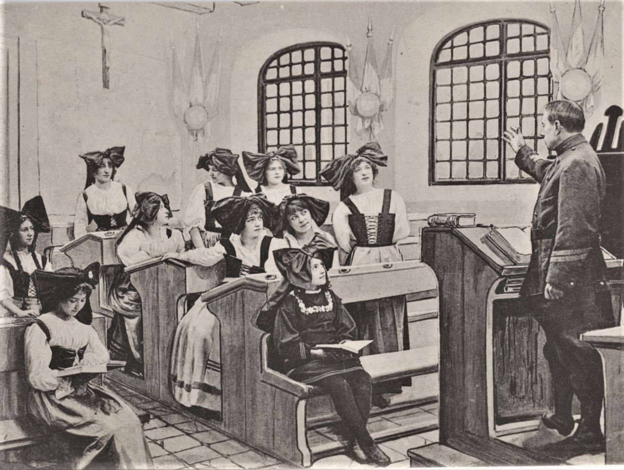 Les dessins et les photos truquées d’écoliers alsaciens en costumes traditionnels fantaisistes ont servi la propagande française. Les classes ressemblaient à la photo ci-dessus.