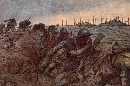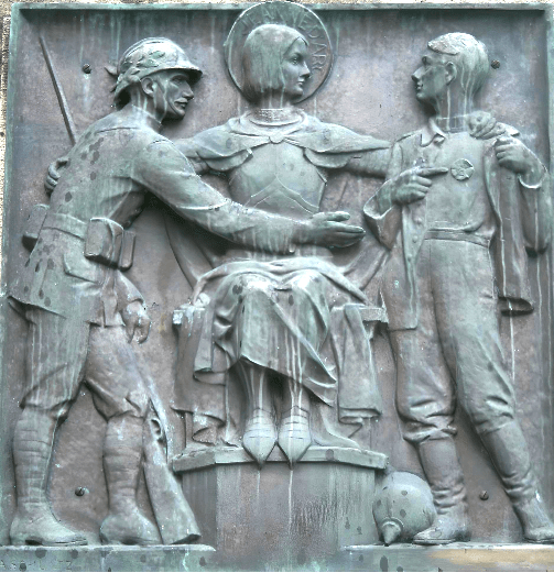 Un Poilu tend la main à un Feldgrau qui cache sous son uniforme une cocarde. L’Histoire est falsifiée, les Alsaciens auraient sous leurs uniformes allemands, un cœur français.