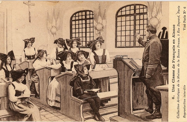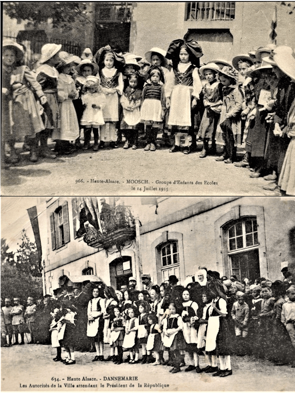 De nombreuses scènes ont été photographiées dans des ateliers parisiens avec des femmes déguisées en Alsaciennes. Les costumes sont incomplets, certaines pièces sont portées à l’envers, les robes sont beaucoup trop courtes mais les femmes portent toutes le Schlupfkàpp cocardisé. Des scènes de classe ont également été inventées, les écolières y sont toutes déguisées. Seules les enfants des familles aisées possédaient leur propre costume qui n’était porté que les jours de fêtes. Comme partout, les enfants portaient le tablier en classe.