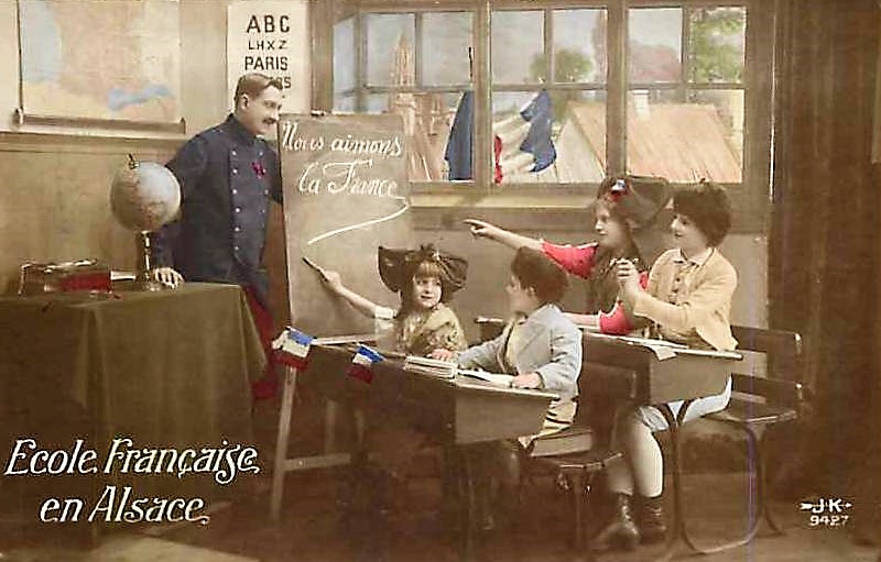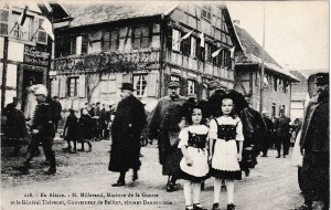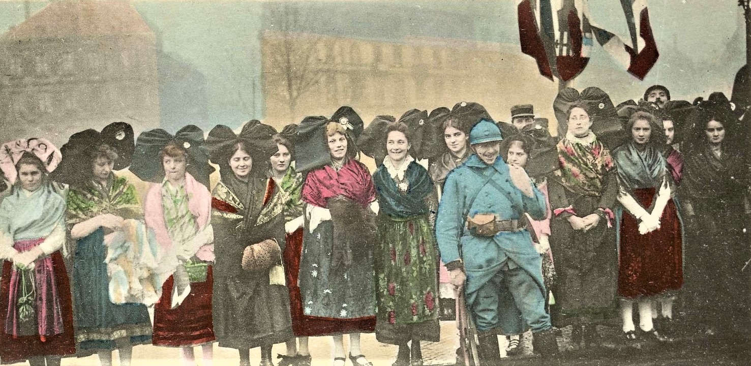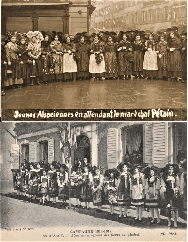 La mascarade des « retrouvailles » de novembre et 1918 met en scène des Poilus chaudement habillés entourés de fausses Alsaciennes en tenues trop légères pour la saison. Certaines de ces photos ont été réalisées en studio. Curieusement, il n’y a pas d’Alsaciens sur les photos, ils ne sont assez décoratifs et ne font pas fantasmer. Ce sont des photos de propagande destinées à faire croire au monde entier pour faire croire que le rêve des Alsaciens est de devenir français.