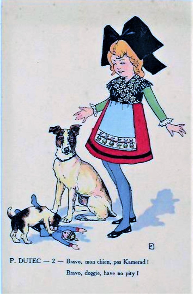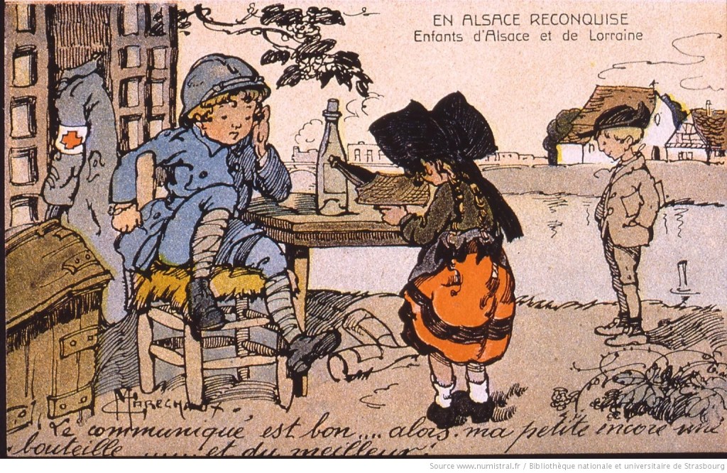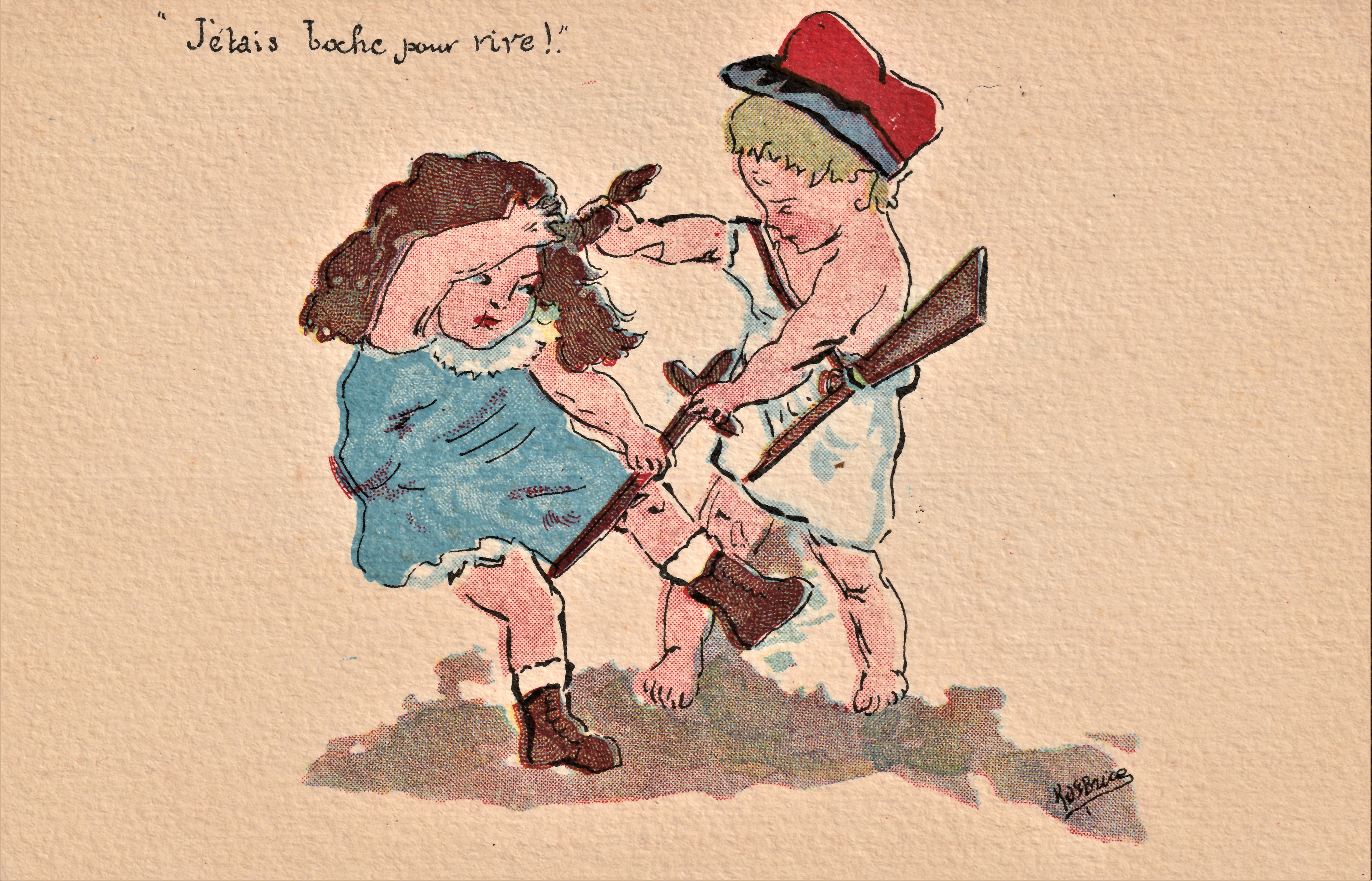 Durant la guerre de 14/18, sous prétexte d’humour, de nombreux dessinateurs français ont créé des cartes postales racistes représentant des enfants jouant à la guerre.