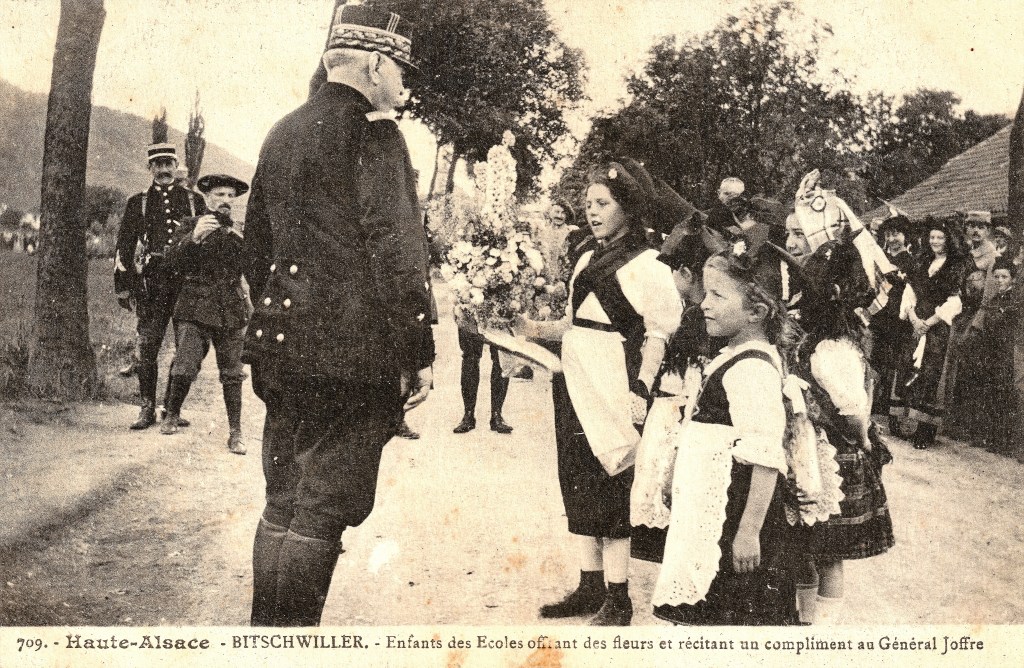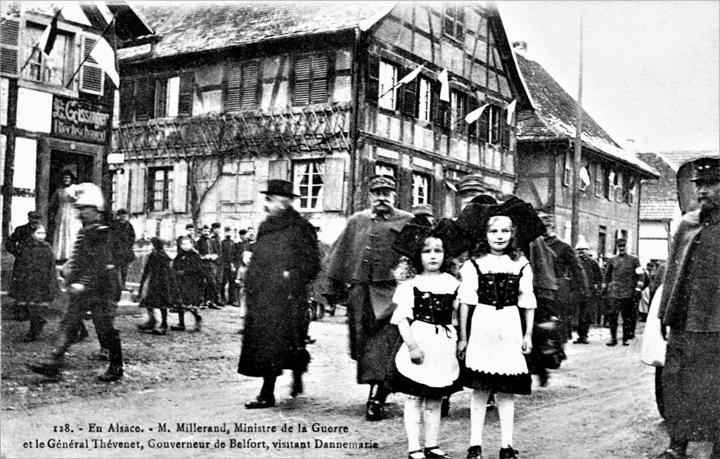 Le service de propagande veut faire croire aux Français et à leurs alliés que les Alsaciens sont heureux d’être « libérés » par le « Pays des droits de l’Homme ». Pour prouver ses dires, de nombreuses cartes postales mensongères sont éditées. Pourtant, dès son arrivée à Thann en août 1914, l’armée française fusille plusieurs habitants de la ville, dont le maire et le receveur des postes.