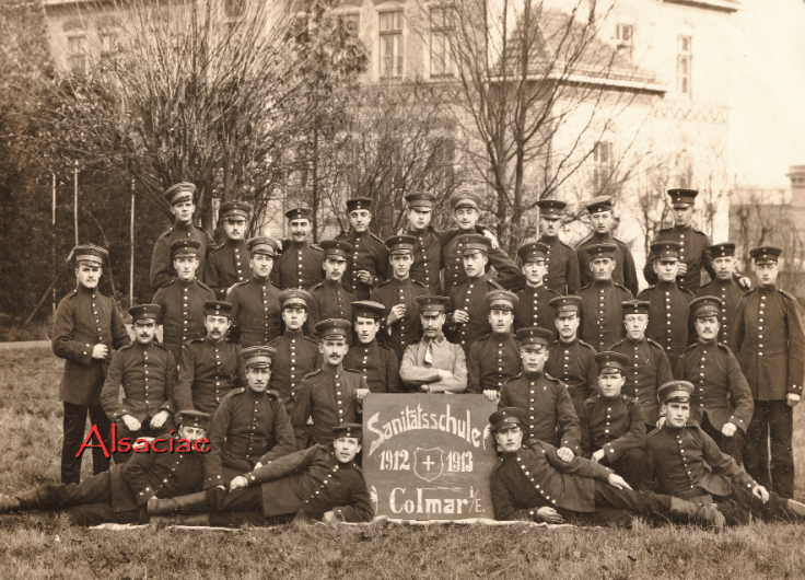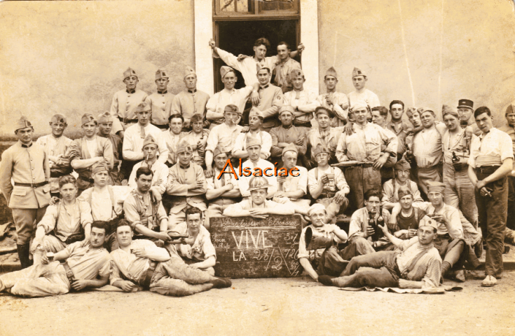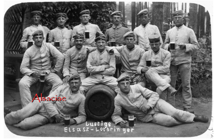 Après l’Armistice de 1918, les Alsaciens seront mobilisés dans des régiments encadrés par des sous-officiers alsaciens bilingues. Comme leurs pères, ils continueront à poser derrière une pancarte rédigée en allemand. « Die lustigen Elsässer »