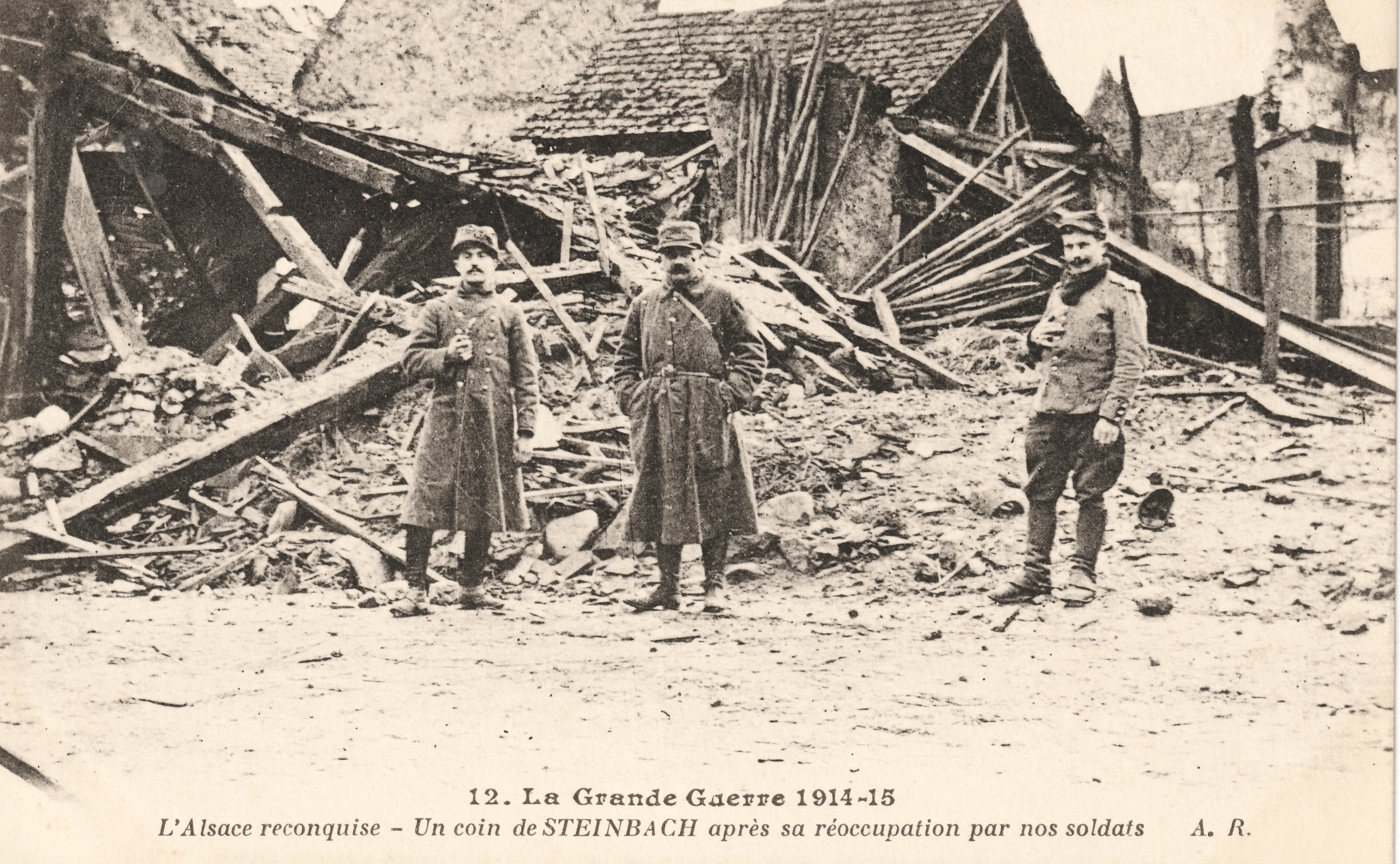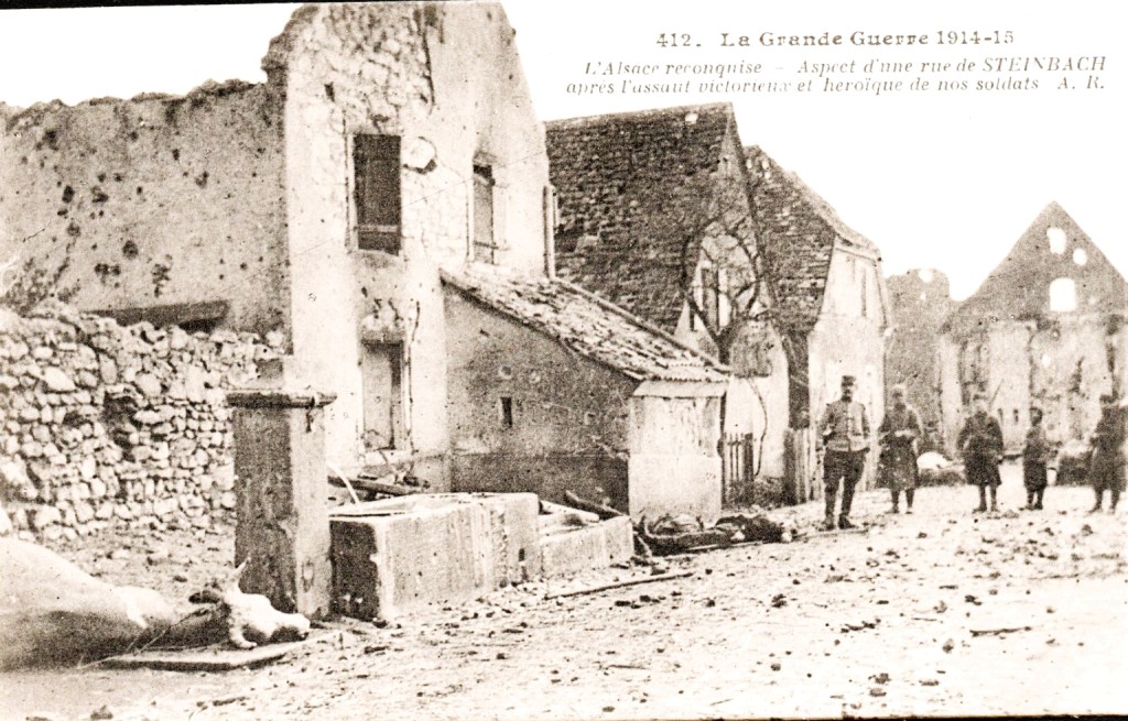 Malgré toutes les barricades qui en défendaient l’entrée, malgré les masses allemandes armées de nombreuses mitrailleuses, les Français ont enlevé Steinbach. Le terrifiant combat qui se livra dans ses rues transforma en un amas de ruines la malheureuse cité alsacienne qui avec la liberté, retrouvera bientôt son ancienne prospérité.Après la prise de la ville, le commandant des troupes françaises dut faire construire pour ses soldat des abris avec les matériaux des maisons incendiées. (Excelsior 7/03/1915)