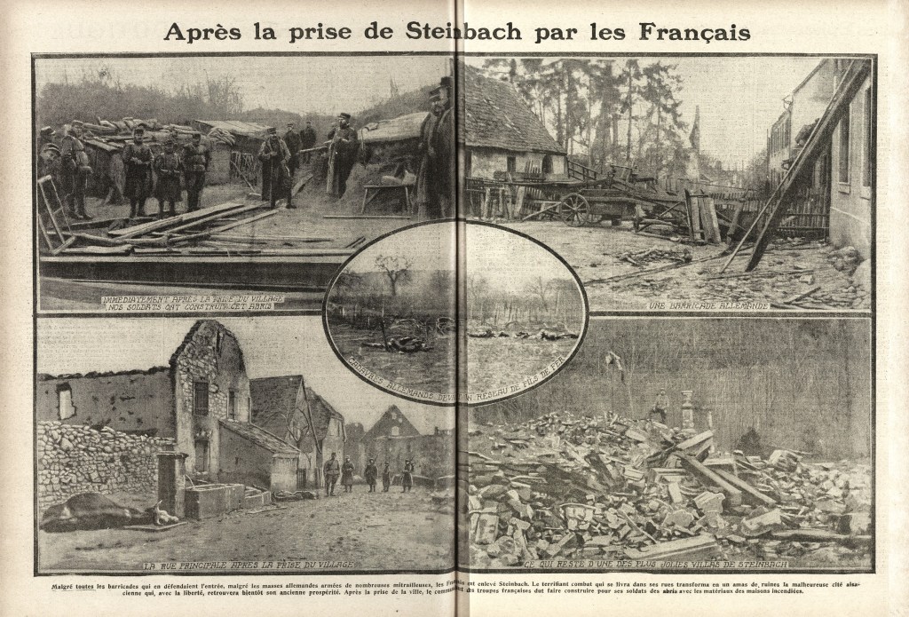 Aujourd’hui, les trois quarts de Steinbach sont aux mains des Français qui durent faire le siège de chaque maison, les Allemands ayant transformé de nombreux bâtiments en véritables redoutes. Ce n’est que grâce au secours de l’artillerie que la prise de Steinbach fut possible. Cette malheureuse localité a bien souffert du bombardement, devenu nécessaire cependant par le système de défense des Allemands.