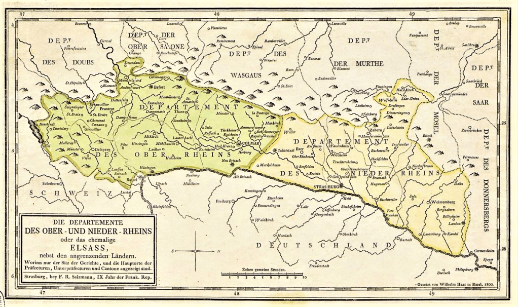 La frontière administrative court le long du Rhin, voie de communication qui est décrétée « frontière naturelle » depuis la Révolution. C’est une des raisons des tentatives d’éradication répétées de la langue maternelle des Alsaciens décrétée « langue de l’ennemi » voire « langue des boches ».