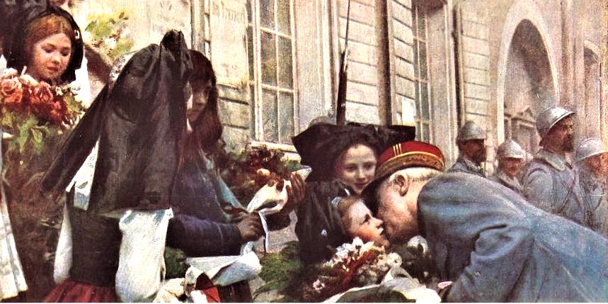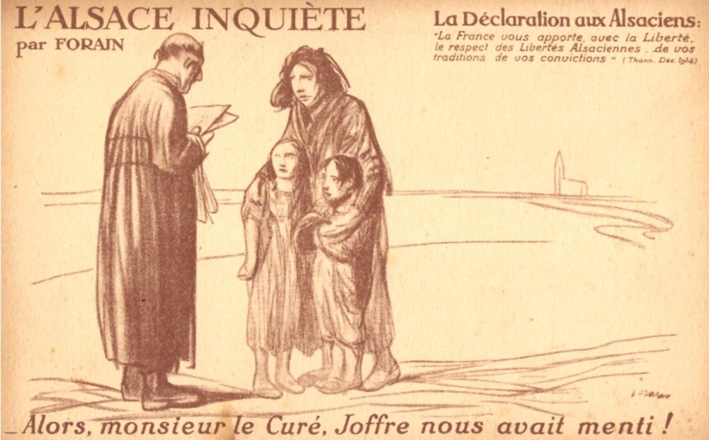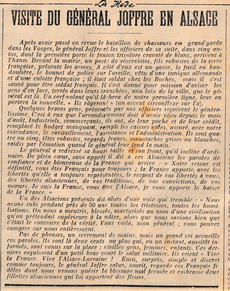 Falsification de l’Histoire, le baiser de Joffre s’adressait à la France et à ses alliés, pas aux Alsaciens qui étaient germanophones. Cette illustration parue dans un journal de mode est trompeuse, les Alsaciennes portent le costume du Kochesberg (nord de l’Alsace) inconnu à Thann, le maire fusillé par l’armée française en août 1914 est présent sur l’image. Le receveur des Postes impériales a également été fusillé. Thann était en deuil, tous les hommes valides, des femmes et des enfants ont également été arrêtés et déportés en France dans d’horribles conditions : coups humiliations.