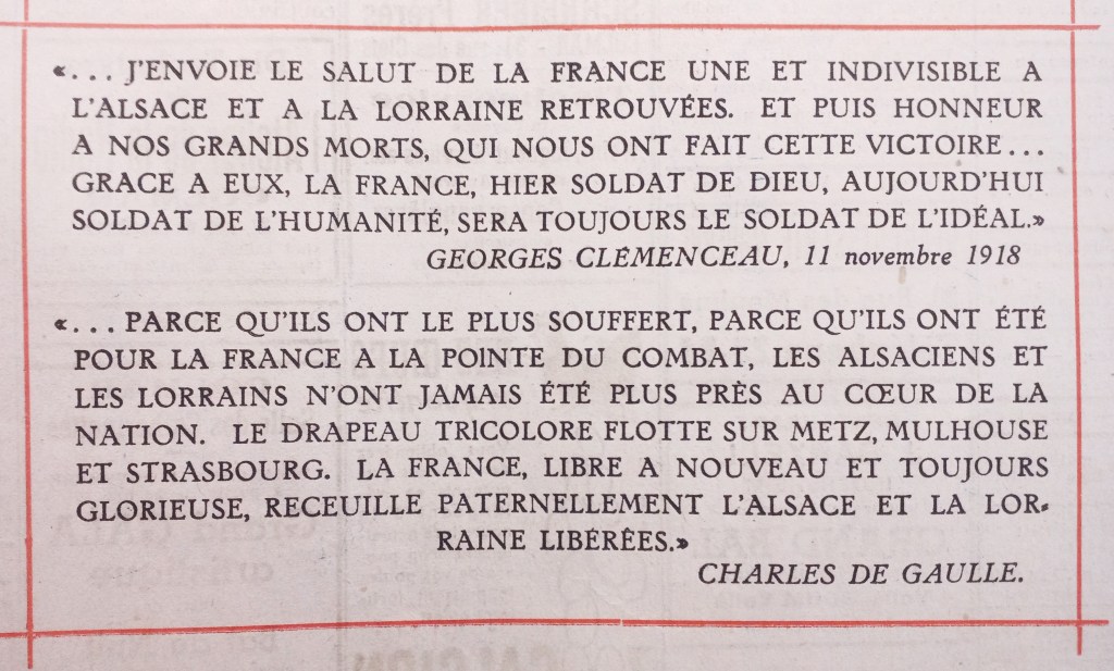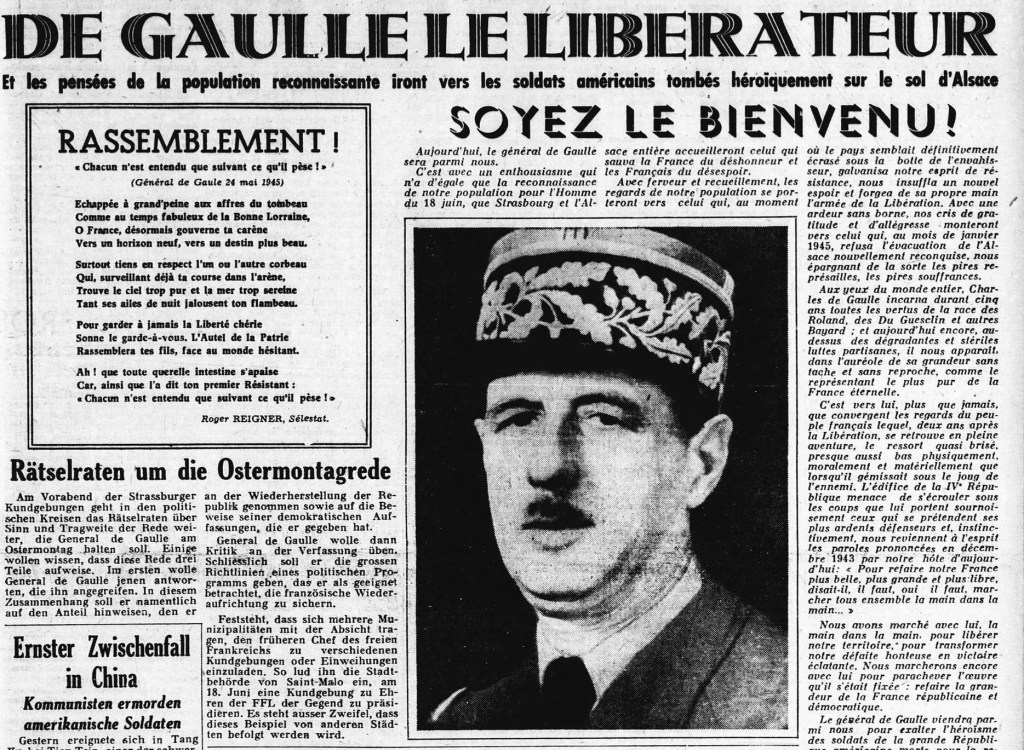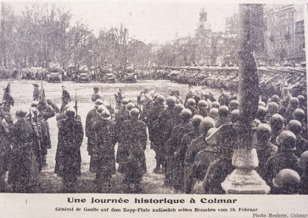 La majorité des Alsaciens vouaient à de Gaulle une aveugle dévotion. Par son charisme, et avec l’aide de la presse, il mettait au second rang les généraux combattants Delattre de Tassigny et Leclerc, les vrais libérateurs de l’Alsace. La guerre ne l’intéressait pas, il voyait plus loin.