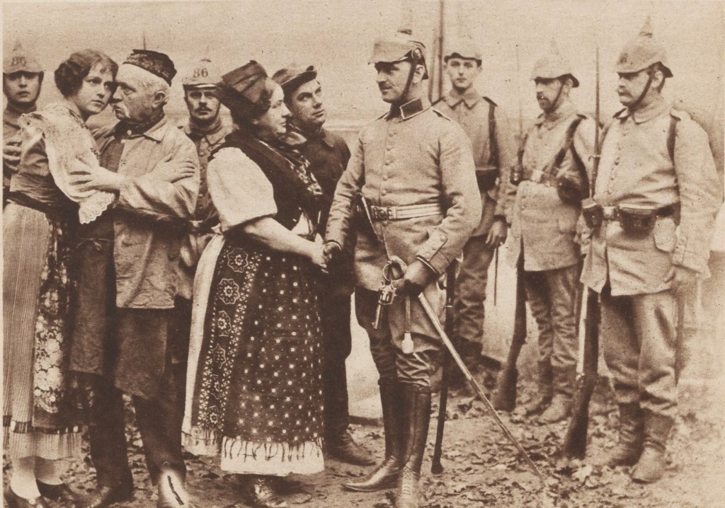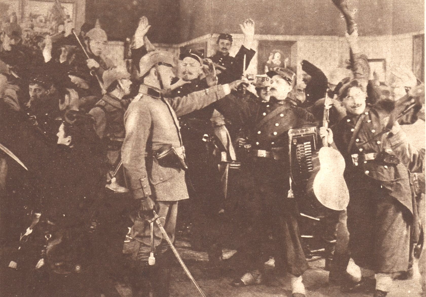 Images d’un film de propagande. Une patrouille allemande interrompt une orgie organisée par des militaires français qui se sont introduits dans une maison alsacienne. La mère remercie chaleureusement l’officier allemand tandis que le père console sa fille outragée.