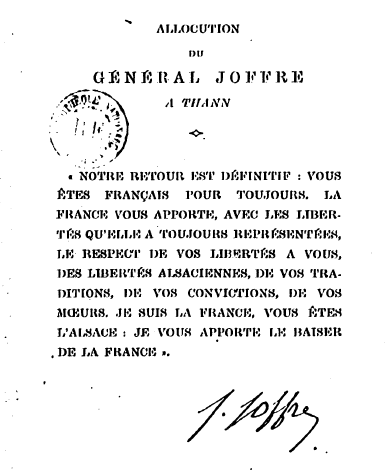 Joffre s’adresse à la presse française et internationale mais pas aux Alsaciens qui sont pour la plupart germanophones et ne sont pas en mesure d’entendre son discours.