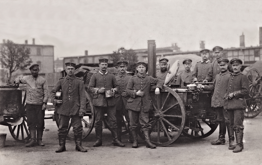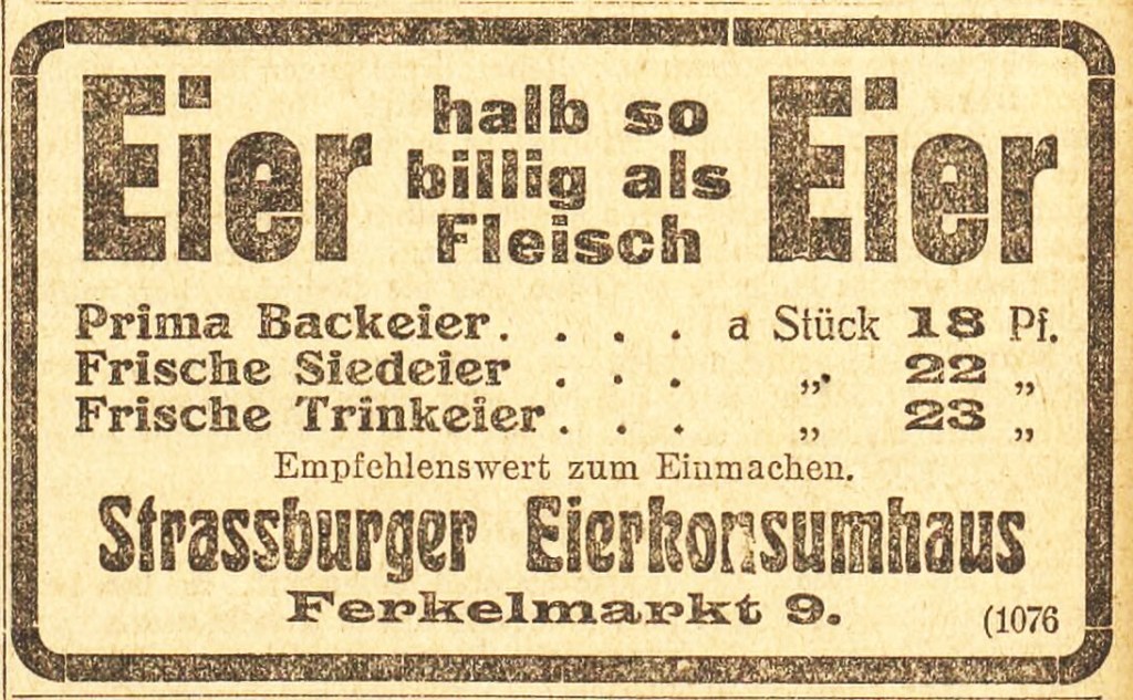 Afin de lutter contre la misère et d’aider ses habitants à se nourrir convenablement, la Ville de Straßburg, à l’instar d’autres grandes villes d’Allemagne, adopte des cuisines roulantes municipales, les « Gulasch-Kanonen », comme on les appelle plaisamment. Elles distribuent à domicile un repas chaud pour 30 pfennigs. En 1916, un œuf coûte entre 18 et 23 pfennigs.