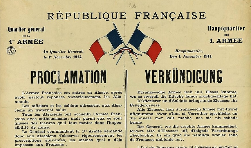 Dès son arrivée en Alsace, le général Dubail, commandant de la 1ère armée française instaure un régime de dictature militaire. Après avoir proclamé un salut fraternel en langue alsacienne, il menace les Alsaciens qui aideraient leur patrie allemande des pires représailles.