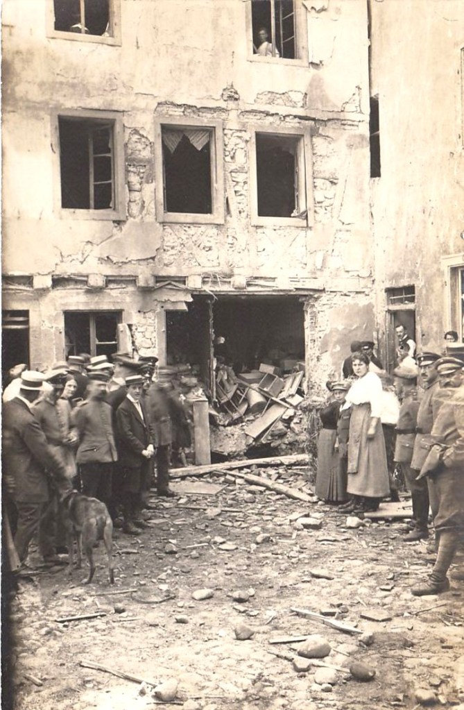 Dieses Propagandagemälde von Bettanier entspricht nicht der Realität. Das Auftauchen französischer Bomber löste in der Bevölkerung des Elsass und des Rheinlands Panik aus. Flugplätze, Bahnhöfe, Kasernen und Fabriken wurden regelmäßig bombardiert, aber auch die Stadtzentren und ihre Bewohner. Wenn ein französisches Flugzeug abgeschossen wurde, fanden Vergeltungsflüge über den Städten statt, die zahlreiche Schäden verursachten. Viele Zivilisten wurden getötet und verletzt. Es war weitaus weniger gefährlich, seine Bomben auf Zivilisten abzuwerfen als auf das Militär. In ihrem Kriegstagebuch legt die Colmarerin Esther Elisabeth Levy Zeugnis ab: