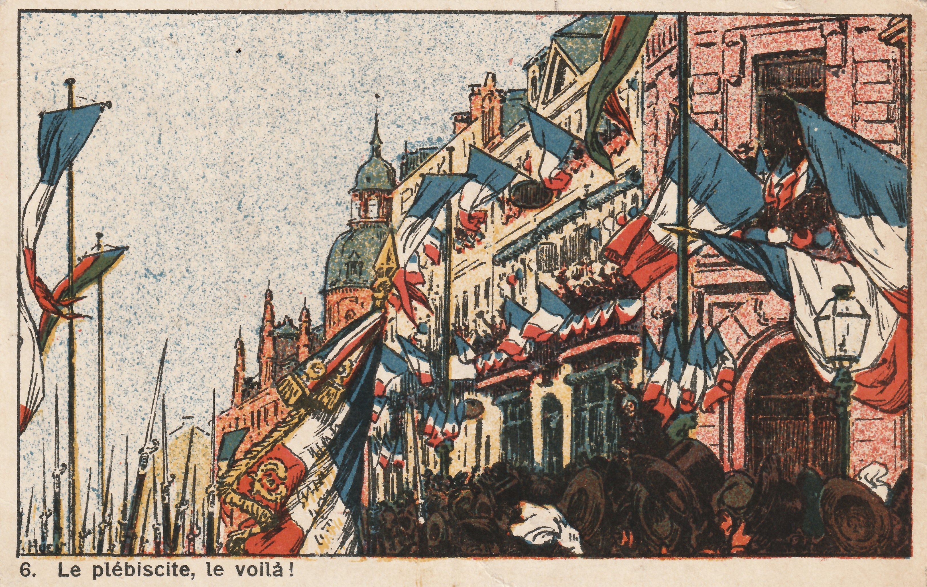 Des Comités de réception préparent depuis des mois les visites officielles. Les villes alsaciennes sont transformées en immenses parcs d’attractions patriotiques. Des centaines de drapeaux tricolores sont envoyés de France pour pavoiser les maisons. Idem pour des déguisements d’Alsaciennes flambant neufs sortant de la même usine parisienne. Les grandes coiffes noires popularisées par la propagande sont inconnues dans la plupart des villes alsaciennes. La cocarde tricolore est une hérésie.