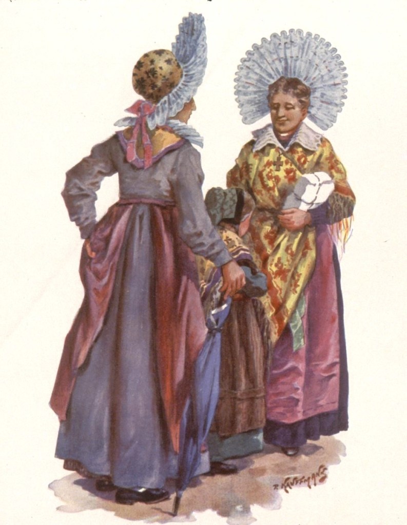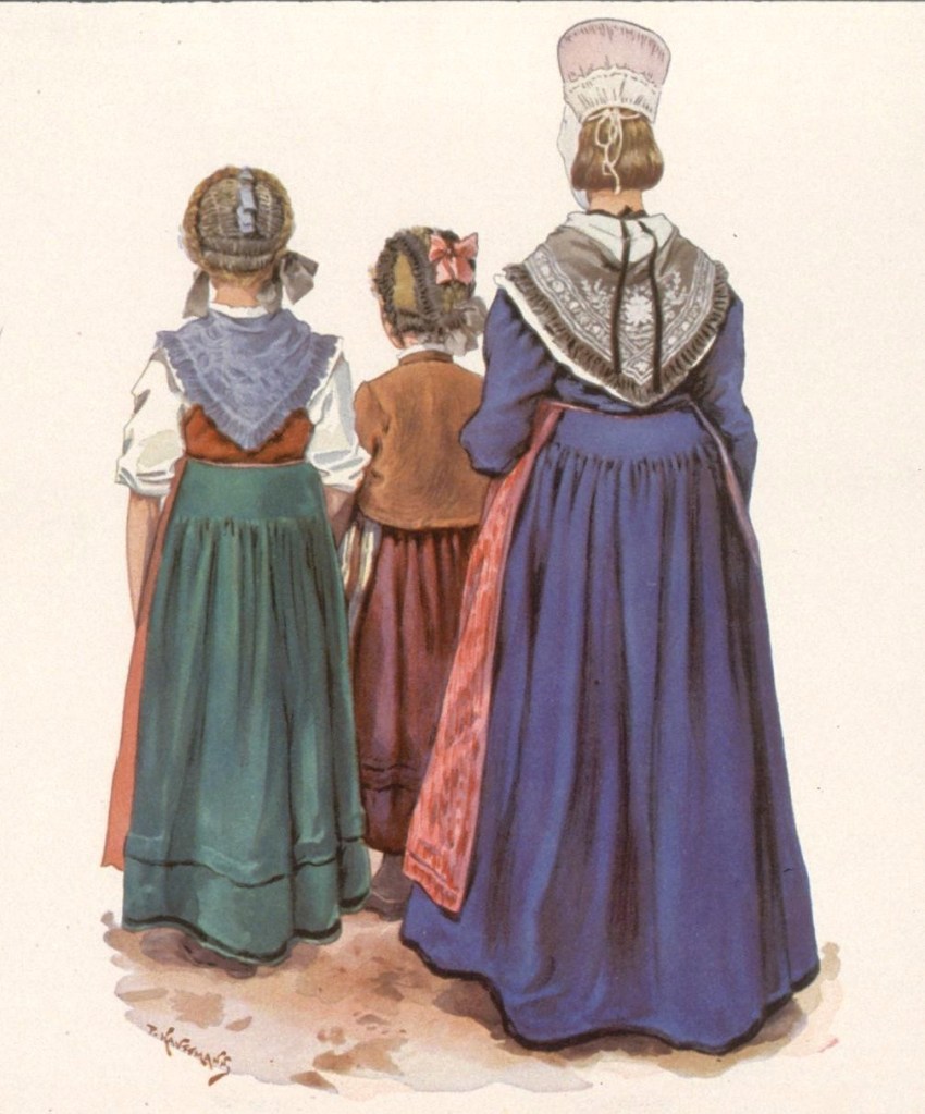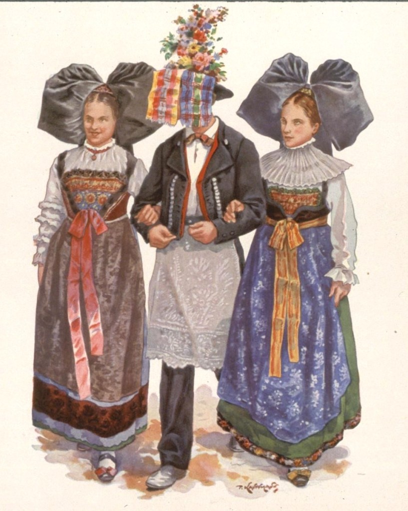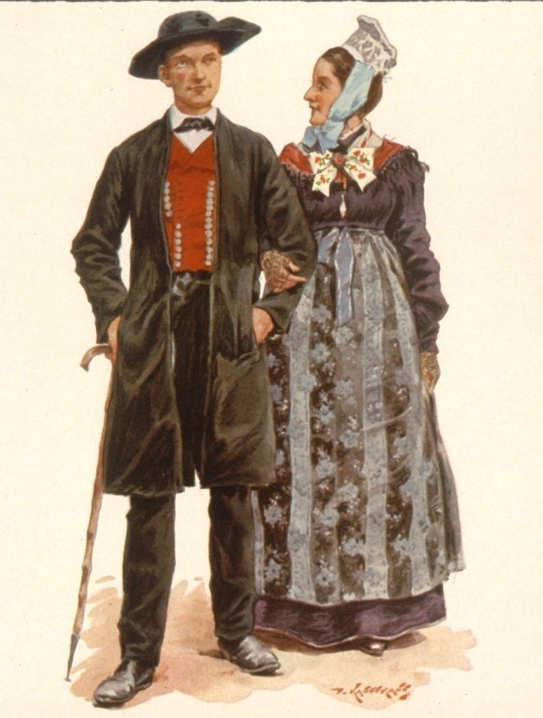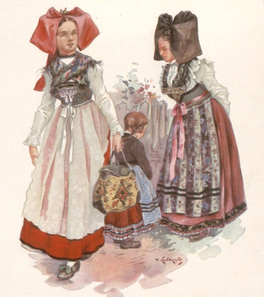 L’illustrateur Paul Kauffmann, né à Belfort en 1849, est le fils de Franz-Josef Kauffmann originaire Saint-Louis et de la bernoise Margaretha Cretin. Tout comme Loux et Spindler, Kauffmann est un témoin important de la vie campagnarde en Alsace durant la période impériale. Les riches habits ne sont portés que les dimanches et jours de fêtes et varient selon le village, la religion, le statut social et familial. La grande coiffe standardisée par la propagande n’existe que dans le Kochesberg.