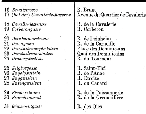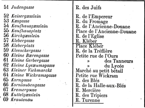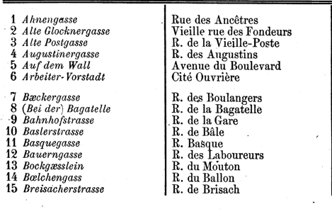 Um französische Reisende zu empfangen, die Stadt Colmar ersuchte die kaiserlichen Behörden um die Genehmigung, zweisprachige Straßenschilder anzubringen. Die einzige Auflage bestand darin, den deutschen Text über der Übersetzung anzubringen. Nach langen Recherchen gaben die Stadtarchivare den Straßen Colmars ihre ursprünglichen deutschen Namen zurück. Ihre Arbeit wurde 1872 in der auf Französisch verfassten « Nomenclature des voies publiques de la Ville de Colmar » festgehalte.
