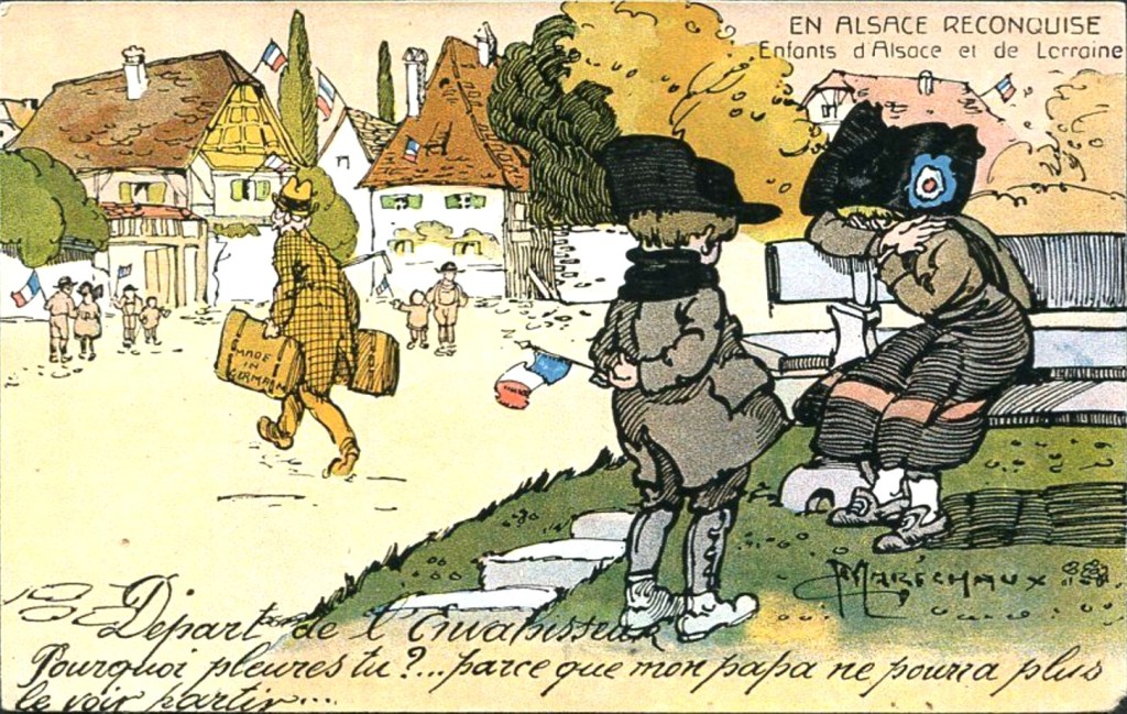 Gaston Maréchaux, (1872-1936) est un illustrateur de livres pour enfants, mais son fond de commerce est la guerre de 1914/18. Par ses sympathiques dessins, il raconte une Histoire mensongère de l’Alsace. Après l’Armistice, il édite une série de cartes postales « En Alsace reconquise ». On y trouve tous les clichés du genre : Alsaciens germanophobes, tombe de Poilus alsaciens ainsi que les inévitables cocardes tricolores. Maréchaux s’est trompé, il a affublé les coiffes alsaciennes de cocardes anglaises rouge-blanc-bleu.