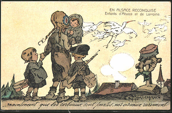 Gaston Maréchaux, (1872-1936) est un illustrateur de livres pour enfants, mais son fond de commerce est la guerre de 1914/18. Par ses sympathiques dessins, il raconte une Histoire mensongère de l’Alsace. Après l’Armistice, il édite une série de cartes postales « En Alsace reconquise ». On y trouve tous les clichés du genre : Alsaciens germanophobes, tombe de Poilus alsaciens ainsi que les inévitables cocardes tricolores. Maréchaux s’est trompé, il a affublé les coiffes alsaciennes de cocardes anglaises rouge-blanc-bleu.