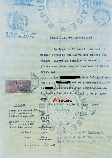 da Frankreich Kanonenfutter benötigt, werden die Elsässer und Moselaner gemäß dem Gesetz vom 10. August 1927 von Amts wegen eingebürgert. Trotzdem müssen sie bis zu ihrem Lebensende für alle offiziellen Vorgänge, wie die Erneuerung ihres Personalausweises, ihren Staatsangehörigkeitsausweis vorlegen, den sie bei Gericht erhalten haben.