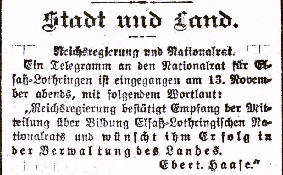 Le Gouvernement allemand prend acte de la sécession de l’Alsace-Lorraine. Réponse de Berlin au Gouvernement d’Alsace-Lorraine : « Le Gouvernement impérial accuse réception de l’information de la constitution d’un Conseil national et lui souhaite un bon succès dans l’administration du pays. Signé Friedrich Ebert (Chancelier) & Hugo Haase, président de l’USPD »
