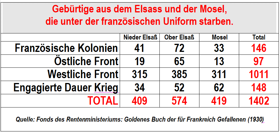 · Rund 8600 gebürtige Elsässer-Lothringer kämpften in den Reihen der französischen Armee, 1400 verloren ihr Leben.