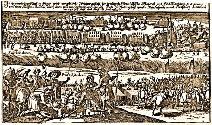 Marschall Turenne wird am 27. Juli 1675 in Sasbach von dem kaiserlichen Artilleristen Koch durch eine Sichelkugel getötet.