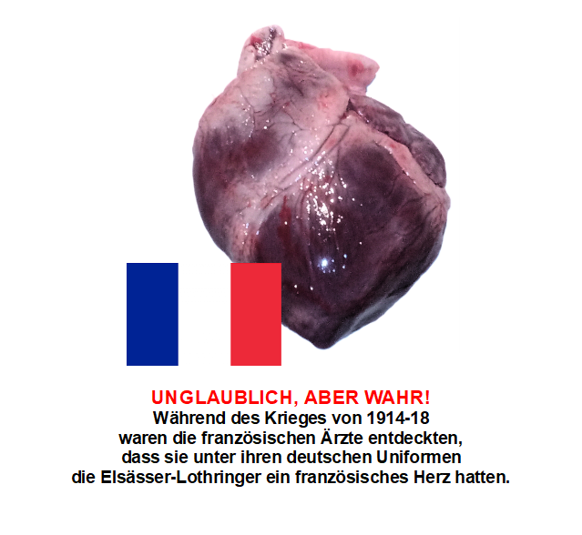 Der Militärmaler Victor Huen aus Colmar erfand 1921 das Konzept des französischen Herzens. Mit der Unterstützung des deutschfeindlichen Abt Wetterlé, dem Direktor des « Nouveau Rhin français », schlug er den Familien verstorbener Feldgrauen vor, seine Zeichnung zu kaufen und die deutschen Militärdiplome ihrer Söhne zu verbrennen.