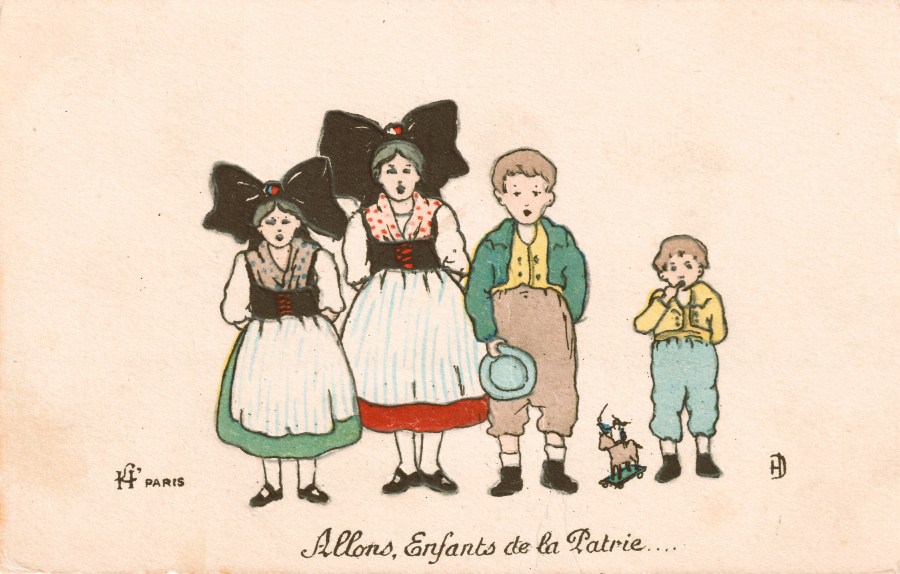Diese lächerliche Verkleidung wurde von zahlreichen französischen Illustratoren und Fotografen und ab 1914 auch von der französischen Armee übernommen. Bei jeder Zeremonie sind die Soldaten von falschen Elsässerinnen mit großer Kopfbedeckung und oft auch von einer falschen diensthabenden Lothringerin umgeben. Diese Inszenierungen sind für die französische und die alliierte Presse bestimmt, um den Eindruck zu erwecken, dass die Franzosen willkommen sind.