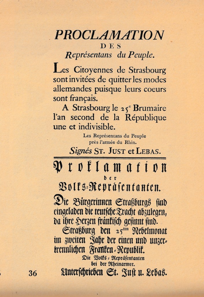 En 1790, la frontière est déplacée sur le Rhin par les Révolutionnaires qui décrètent l’allemand, langue de l’ennemi. Les Alsaciens doivent perdre leur langue , leurs coutumes allemandes et leur religions, puisque leurs cœurs seraient français.