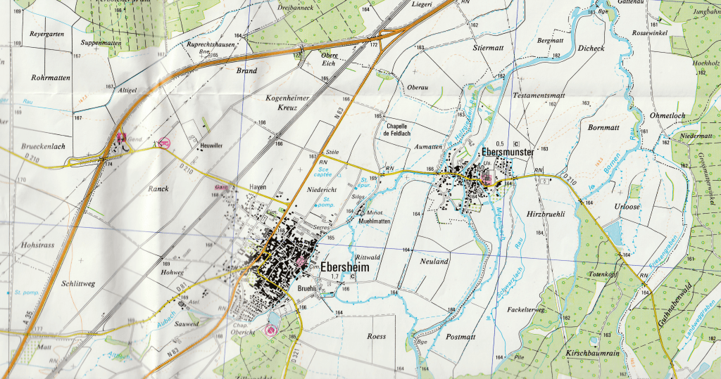 Altweier / Aubure – Burg Breusch / Bourg-Bruche – Erlenbach / Albé – Gereuth / Neubois – Grube / Fouchy – Kestenholz / Châtenois – Krüt (chou) / Kruth – Lüzel (petit) / Lucelle – Masmünster / Masevaux – Mauersmünster (Monastère des murailles) / Marmoutier – Meisengott (mésange) / Maisongoutte – Niedersulzbach / Soppe-le-Bas – Pfirt / Ferrette – Alt-Pfirt / Vieux-Ferrette – Rappoltstein / Ribeauvillé – Roggensbach / Ranrupt – Saal / Salles – Salzern / Saulxures – Schlettstadt / Sélestat – Wanzel / La Vancelle – Wasselnheim / Wasselonne – Weissenburg / Wissembourg – Zabern / Saverne